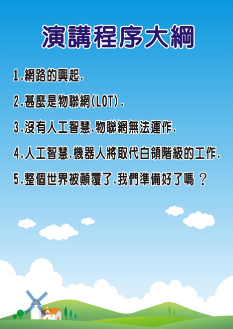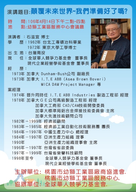 1060414 第五屆第2次專題演講-「顛覆未來世界~我們準備好了嗎?」 首頁 活動園地 專題演講 1060414 第五屆第2次專題演講-「顛覆未來世界~我們準備好了嗎?」 1060414 第五屆第2次專題演講-「顛覆未來世界~我們準備好了嗎?」 石滋宜博士「顛覆未來世界~我們準備好了嗎?」專題演講 時間:106/04/14(五) 14:00 地點:幼獅服務中心二樓會議室 報名表 講義